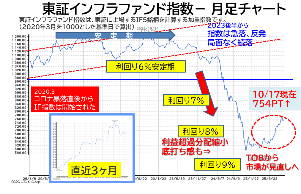 これらの連鎖的ショックで価格下落が起こったと考えられていますが、当初7社となったインフラファンドも2社がスポンサーからのTOBによる上場廃止となり、更なる逆風となる残った投資法人5社のうち4社が利益超過分配を停止・調整した結果、実質的な減配扱いとなり再下落したのです。