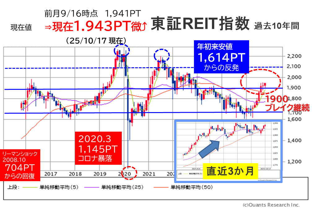 元々過去、東証REIT指数は1,900~2,100位がフェアバリュー妥当ゾーンだったものが下落、米国債券金利の低下予測やトランプ関税不確実性による日銀利上げが身動き取れない状況にマーケットがいち早く反発したと考えられています。