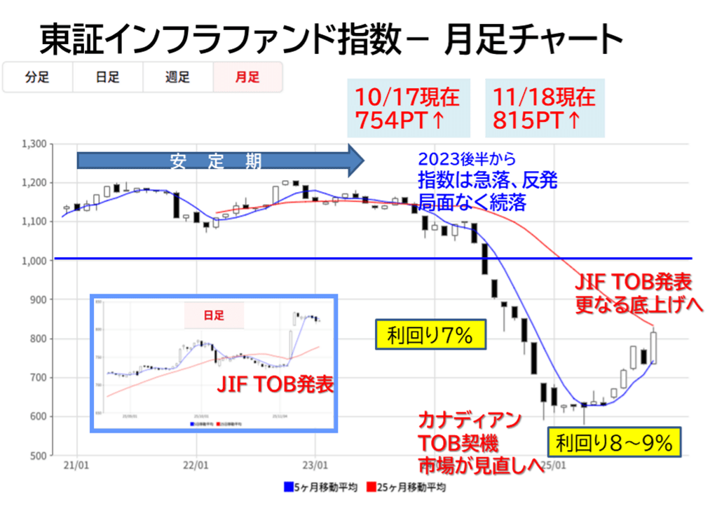 7月にはインフラファンド最大大手のカナディアン・ソーラー・インフラ投資法人にヒューリックから限定的なTOBが発生中、10月には丸紅系のジャパンインフラ(JIF)にもスポンツーからのTOBが発生しており、割安感と今後の運用不透明感が広がった印象です。
