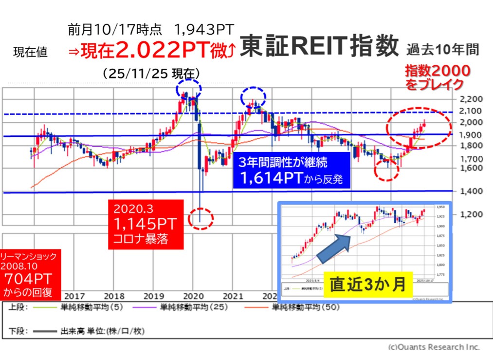 株価下落により3~4%の期待利回りだったものが、5%超えとなる価格下落の調整が続きました。この段階で投資妙味が発生していましたが、いくつかのリートのTOBの発生を契機に安値感が意識され遂に反発、東証REIT指数も指数1,600を底に反発し、7月には遂に1,800、8・9月には1,900台、そしてこの11月には2,000台まで指数は回復・タッチするまでに至っています。